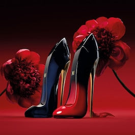 Very Good Girl Elixir atteint l'apogée de la séduction avec un stiletto dégradé rouge et noir contrasté avec un talon doré scintillant.